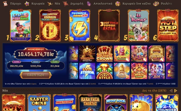 | Slots | Κλασικά, video, bonus, jackpot, αποκλειστικά | Pragmatic Play, Novomatic, Playson, Betsoft | Έως αποκλειστικά υψηλού RTP |